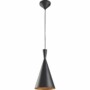 Pendente Genebra com uma cúpula em aço na cor preta, com revestimento interno em alumínio texturizado na cor dourada. Canopla em aço e cabo ajustável em até um metro.